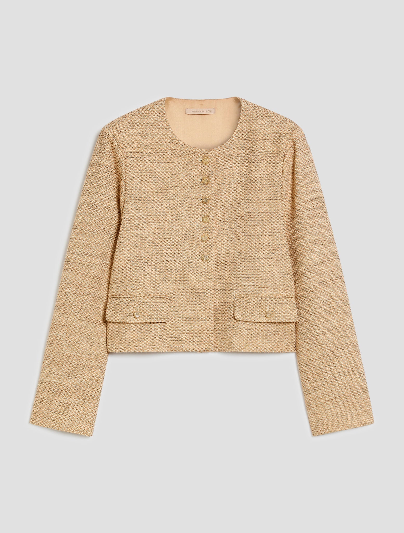 Lavorata a stuoia con un filo lamé per un effetto luminoso, questa giacca d’ispirazione French couture varia il suo design classico grazie ai bottoni bijou ravvicinati nella parte alta. Perfetta sui pantaloni eleganti, ma anche sui jeans.