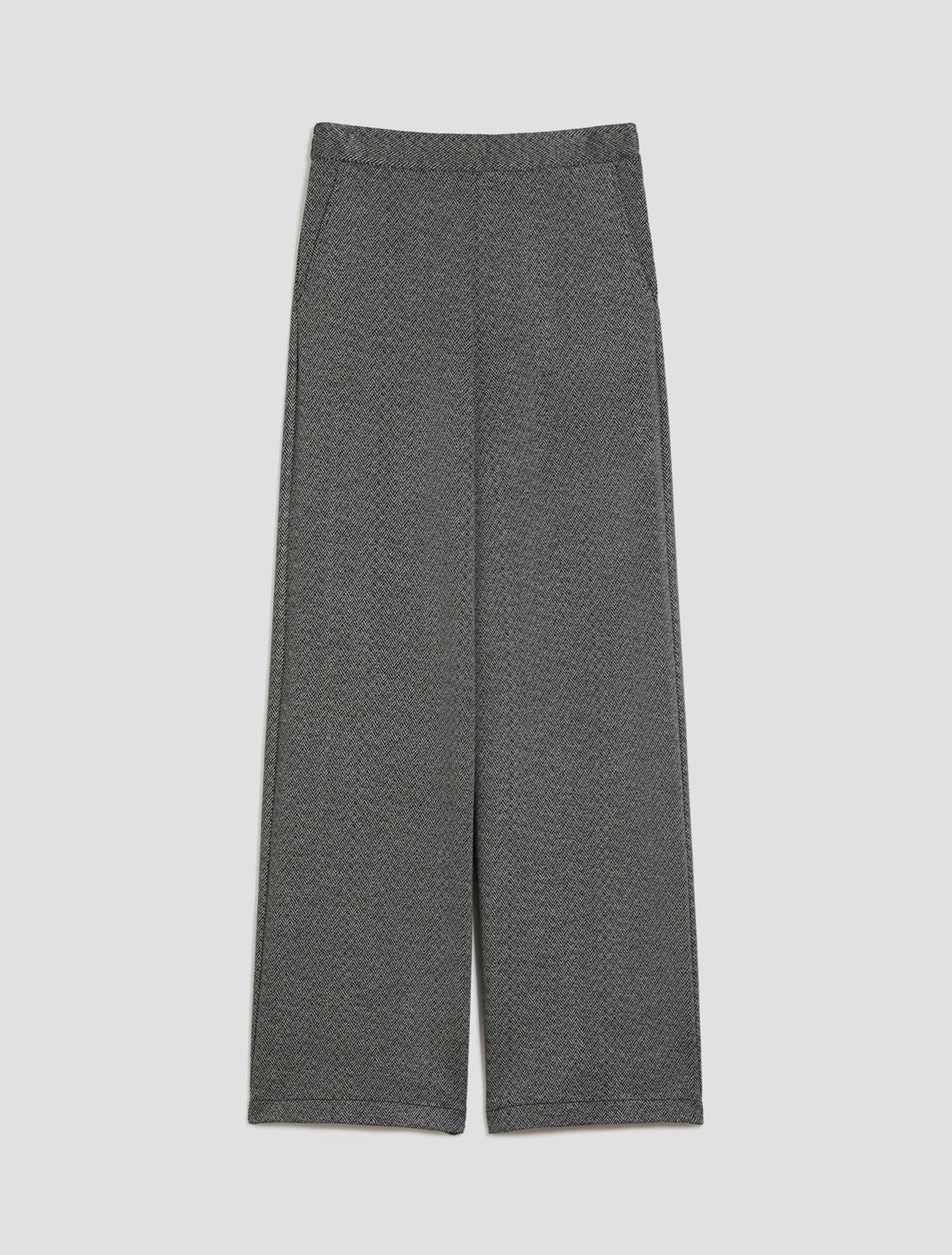 Realizzati in jersey con un blend di viscosa stretch, questi pantaloni presentano un raffinato motivo gessato. La gamba ampia e dritta unita a una vita regolare con elastico interno sul retro garantisce comfort e stile senza compromessi. Le tasche alla francese sul davanti aggiungono funzionalità, mentre il blazer coordinato disponibile in collezione completa perfettamente l’outfit per un look sofisticato e contemporaneo.