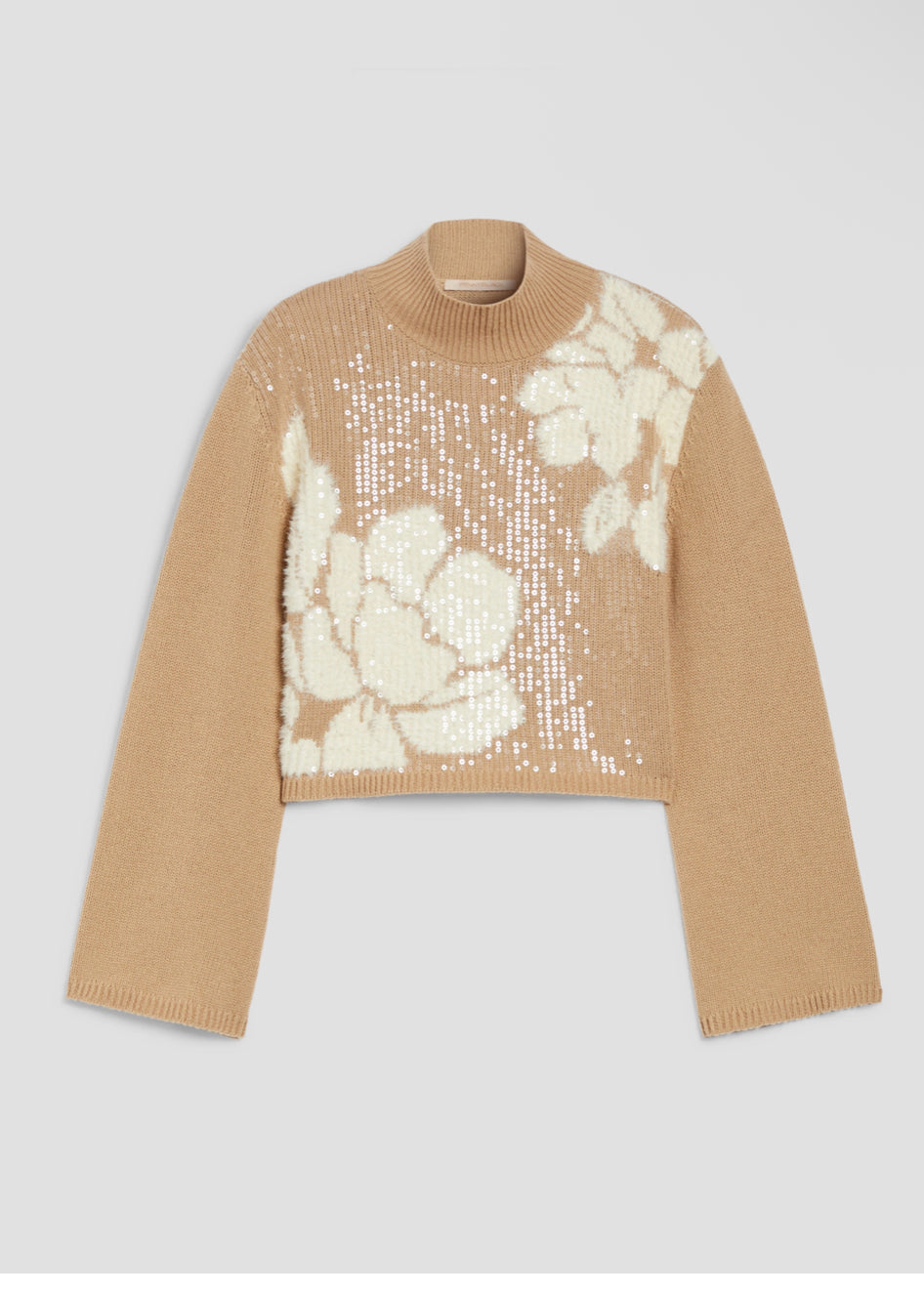 Per rischiarare e riscaldare le giornate invernali con un’abbondante dose di stile, sulla maglia dal taglio cropped sbocciano fiori soffici e si accendono riflessi luminosi.